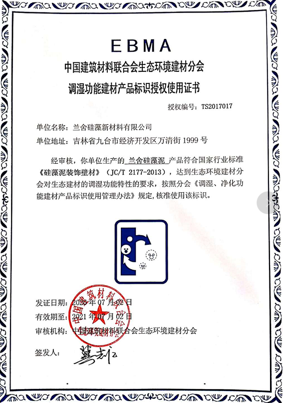 2020年7月初,兰舍硅藻泥以优质的产品性能再次获得中国建筑材料联合会生态环境建材分会的认可,被授权“调湿、净化、抗菌 ”功能建材产品标识。